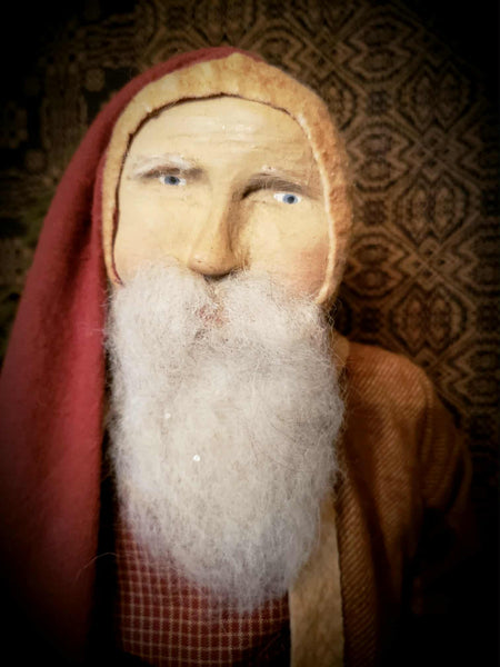 From a Primitive Collectors Private Collection! ♥️Pre loved and in mint condition! Love this Santa! Santa is wearing a long mustard brown coat, brown pants and long stocking hat. He measures 30" high. Handmade by Arnett's Country Store.