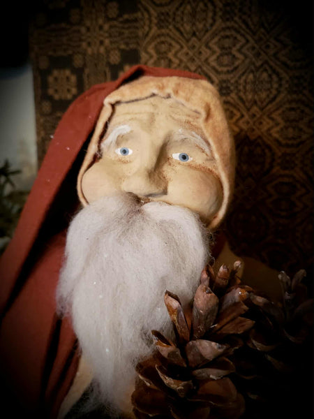 From a Primitive Collectors Private Collection! ♥️Pre loved and in mint condition! Love this Jolly Santa! Cranberry red mini check shirt, mustard pants, green coat and a long stocking hat. Santa measures 23" tall. Handmade by Arnett's Country Store. Retired.