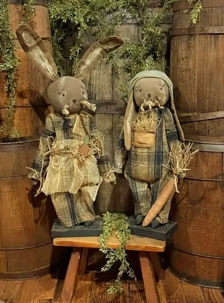 Sammy is 19” tall, not including his ears, he is wearing a blue plaid flannel grungy outfit, holding his carrot, & wearing blue hat. MADE IN THE USA