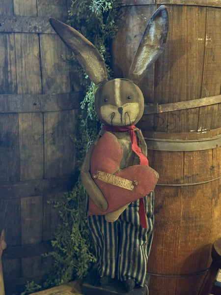 "Harold" is wearing Navy ticking pants and holding his “Be My Valentine” heart. He stands 21” tall not including ears.    Handmade in Pennsylvania