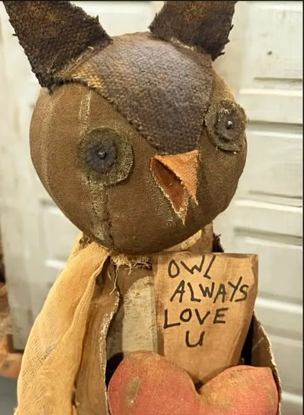 This handmade owl is holding a primitive red heart & tag. He stands 20” tall including ears. Made In The USA