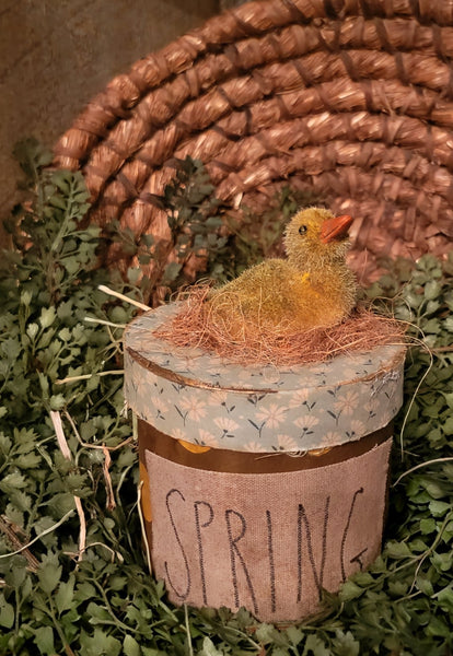 Primitive "Spring" Pantry Box. How adorable are these!!!! Box is handpainted with a fabric label and coordinating lid with a Duck on top. Comes filled with prairie grass and a painted egg. Measures 8 inches high x 4 inches wide. LOVE this artist! Made in USA by Moses Allen Collection