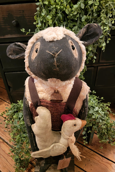"RUFUS The Sheep" is holding a Rooster and stands 28 inches tall and is wearing rust & tan woven overalls.