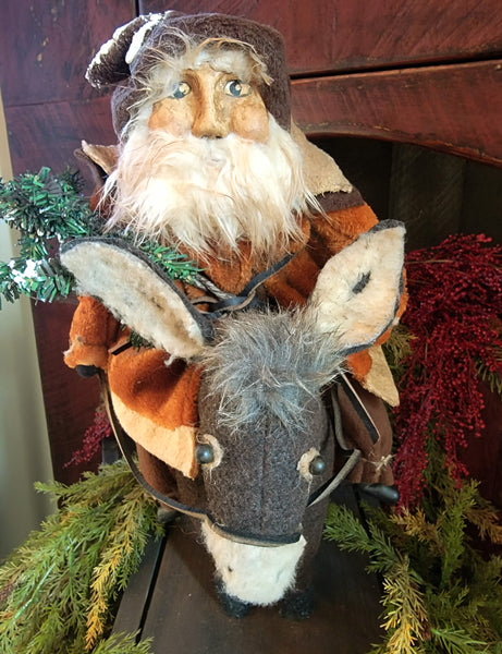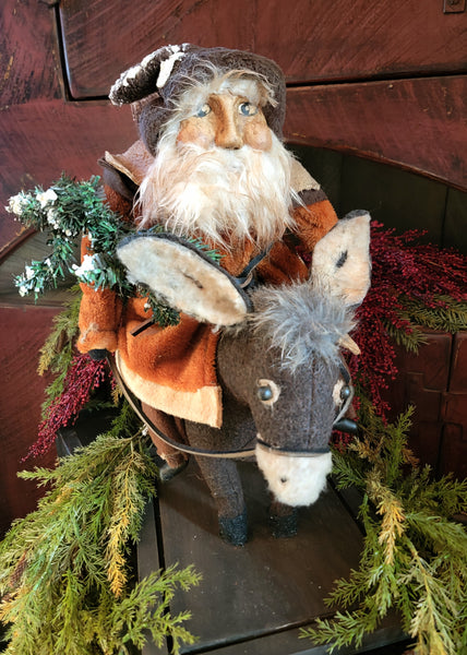 Another Amazing creation by Holly Schmidt! LOVE THIS!! This handmade clay face Santa is wearing rusty color coat and riding a Donkey!  He is holding a twig of greens.  Exquisite detail, one of a kind creation. Measures 16 inches high & sits on an 10.5 inch long wood base. MADE IN AMERICA