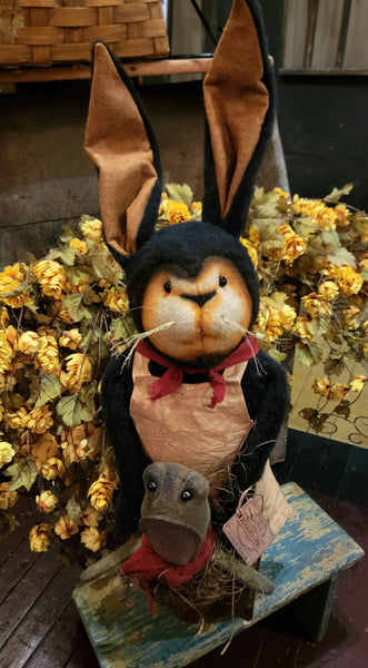 How unique!  Very limited quantity.  "Bubba" is a black fuzzy fur rabbit wearing a canvas style fabric apron and holding a Toad in a grungy burlap sack.