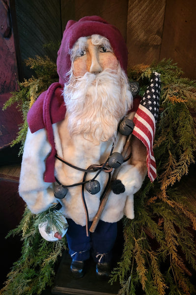 An AMAZING handmade clay face Santa by Holly Schmidt. Exquisite detail, one of a kind creation, even his boots are made of clay! He is holding an American flag and a clay snowman head ornament. Stands 24 inches tall on wood base. MADE IN AMERICA