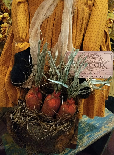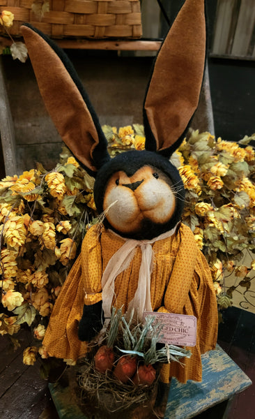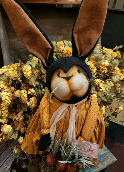 Pudgy "Presley" is wearing a mustard and orange polka dot dress and stands approximately 30 inches tall with bendable ears. She holds a grungy burlap sack of carrots.